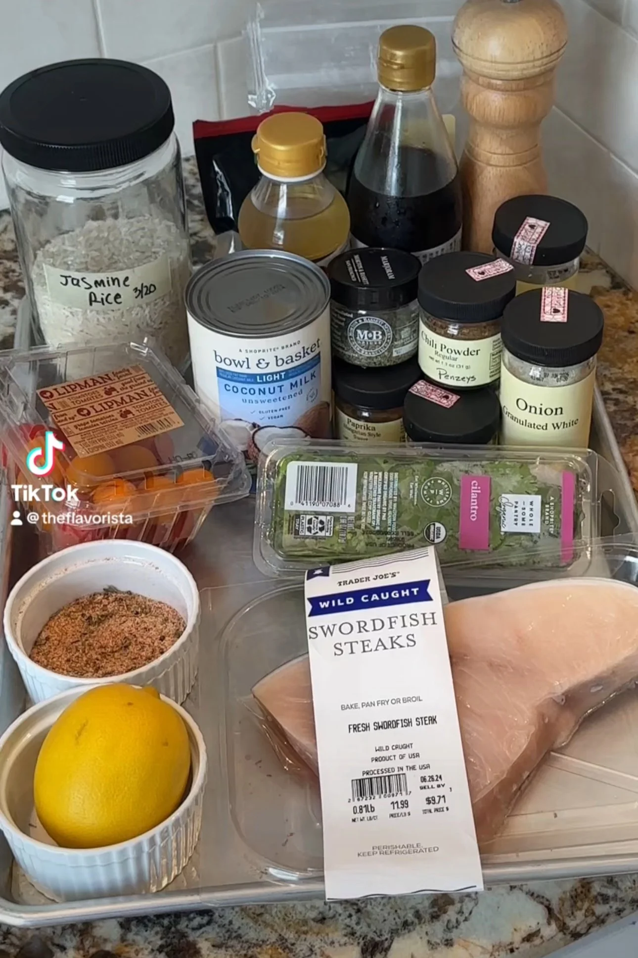 To plate, put down a layer of rice, and one swordfish steak, spoon tomato mixture over top